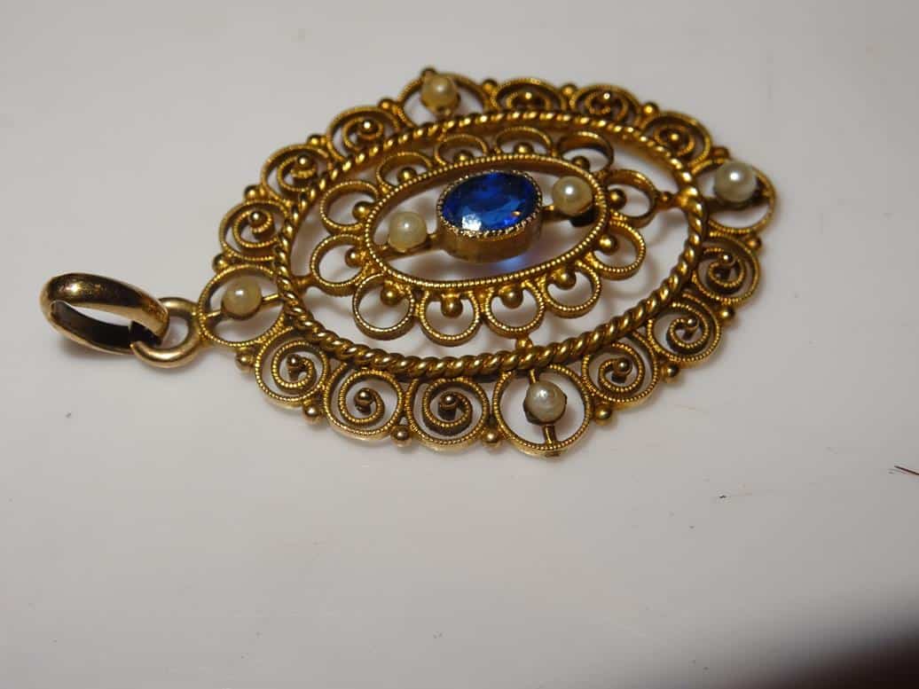 ZobaczZłota zawieszka z szafirem i perłami STARA